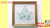 ブルー系の糸で一色刺繍した北海道モチーフの刺繍作品。猫と雪だるま、建物を描いた手刺繍